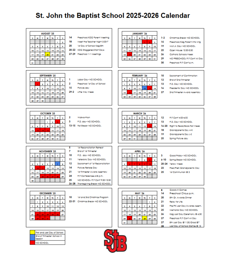 2025 2025 School Calendar – for Parents – St. John The Baptist